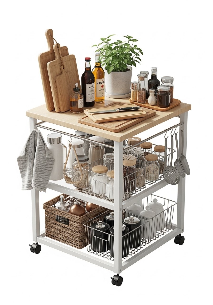 I added a portable kitchen cart to create a dedicated prep and bar zone. Wheels let me tuck it away or roll it closer when hosting. I keep trays and a small fruit bowl on top, with baskets for linens below. Mistake: choosing a cart with no locking wheels — it should stay put. This solution gives the kitchen functional square footage and visually separates cooking from lounging.