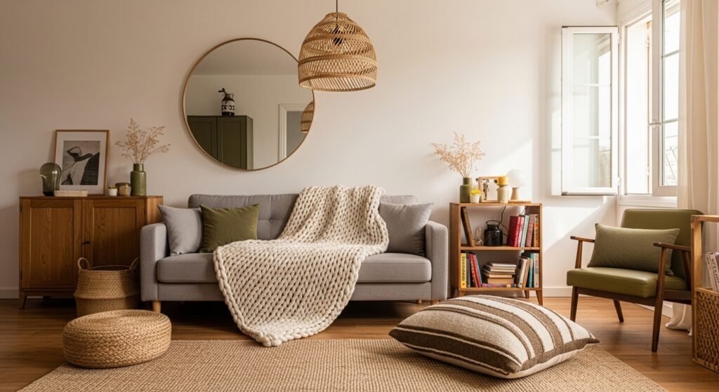 These ideas lean modern-boho and transitional. Most items are under $100, with a few splurges around $150-300. They work in living rooms, bedrooms, entryways, and small apartments. Everywhere I look this year, warm neutrals and rattan are paired with velvet and linen for depth.