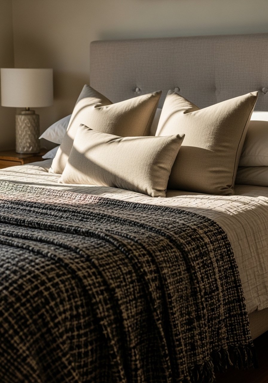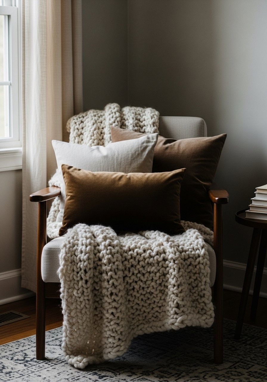The moment I draped a chunky knit throw over my gray sofa, the room stopped looking flat. Layer linen pillows, velvet accents, and a 2×3 foot sheepskin on the chair for contrast. Works best in a cozy corner or bedroom, budget $30-150 depending on materials. Use a 60-30-10 rule for colors, with 60 percent neutral, 30 percent mid-tone, 10 percent bold. Photo trick: textures read more dramatic in photos. In person, keep colors slightly muted. Common mistake is matching all pillow textures. Mix matte and sheen. Grab this chunky knit throw for the same layered feel.
