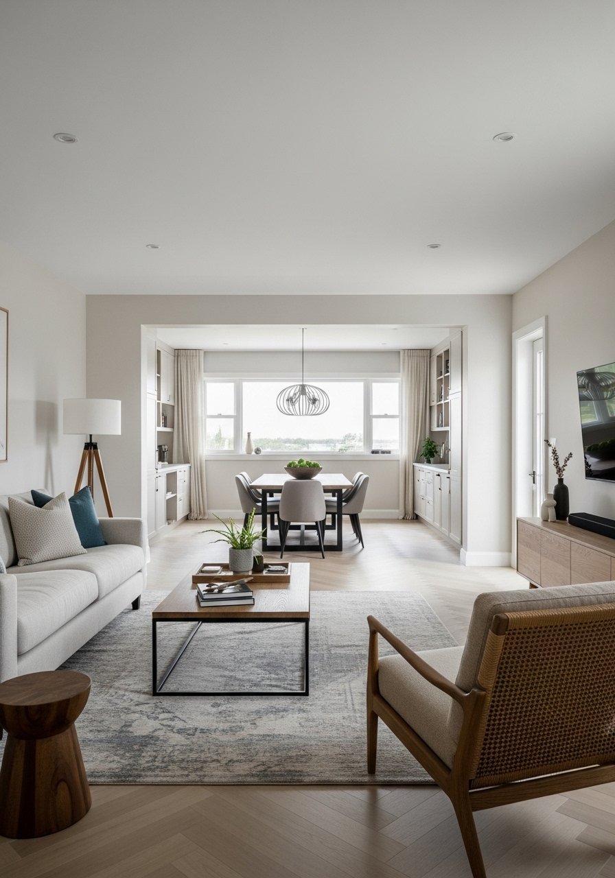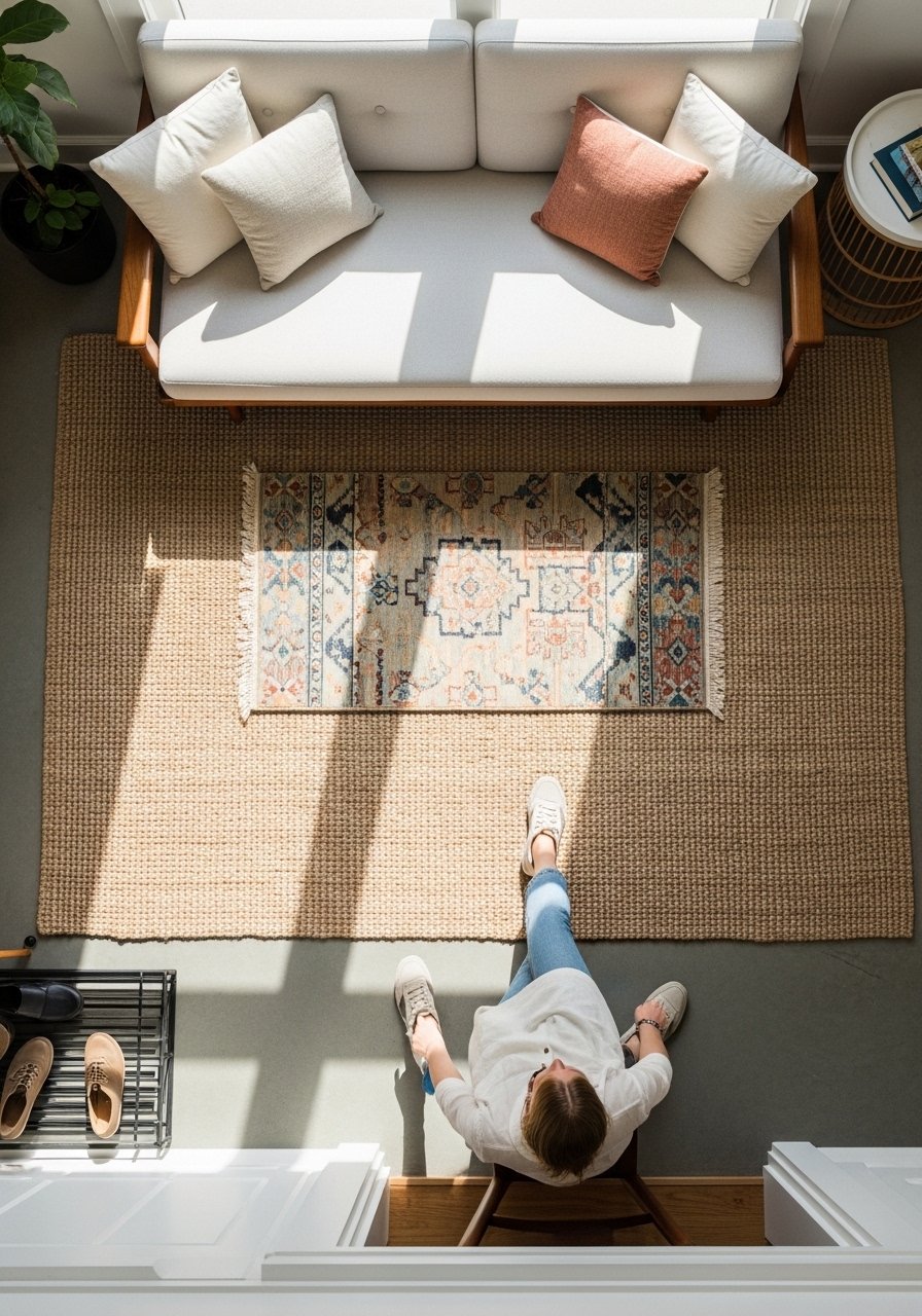Layering rugs can define seating zones in an open plan. I place a large jute rug under the sofa and a smaller patterned rug under the coffee table at a slight angle. For small rooms choose a smaller top rug to avoid feeling chopped. A common mistake is pairing two rugs with clashing scales. Use a solid base rug and a patterned top rug with at least 18 inches of border showing. In photos the combo looks bold. In person, texture helps the pattern settle. Try natural jute rug base and small patterned accent rug.