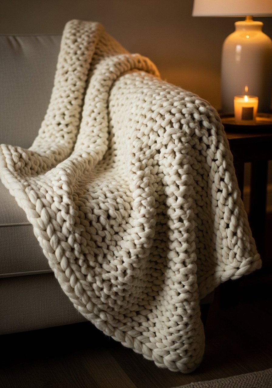 - Chunky knit throw blanket in cream. $35-55. I drape mine over an armchair for instant texture.