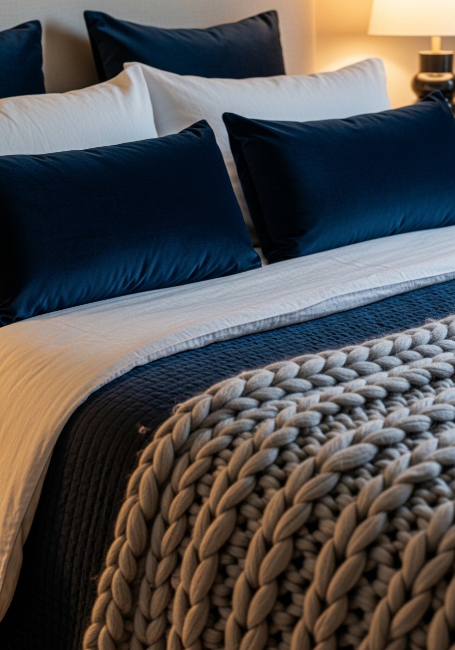 Velvet reads luxe without being fussy. I used navy velvet on a neutral bed to add depth and tie in brass hardware elsewhere. Velvet shows wear under pets. Choose pillow covers rather than fixed pillows, so you can swap seasonally. In photos velvet catches highlights and looks richer than it is. For a true modern glam feel, pair velvet with mixed metallics and a chunky wool throw. Avoid matching velvet colors across the room. Pick velvet pillow covers and mix two jewel tones for contrast.