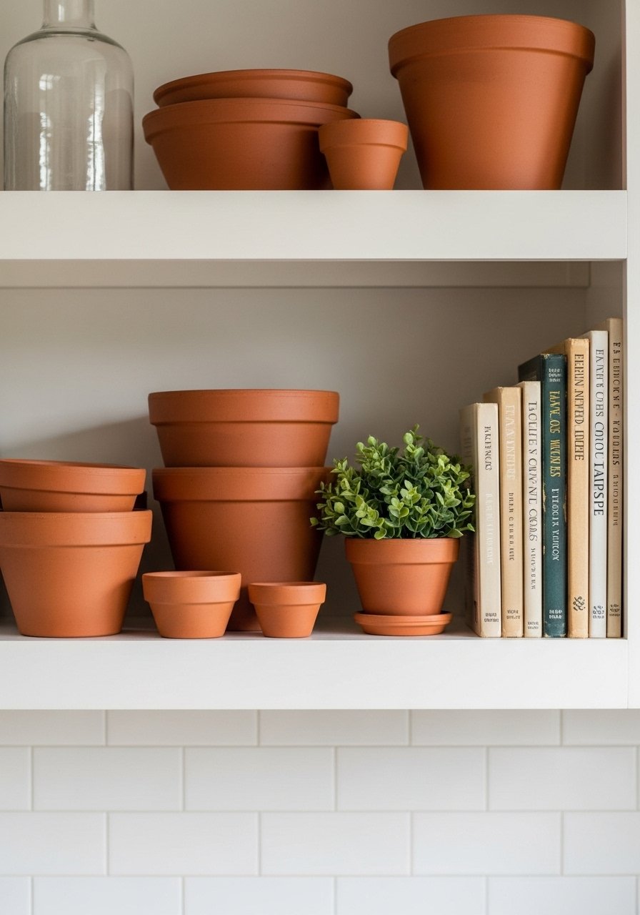 Terracotta introduces earthy texture and warms shelves instantly. I group three to five pots by height and size, using odd numbers for interest. In photos terracotta can read orange. In person, choose warm terracotta or a muted clay so it reads sophisticated. Avoid shiny glazes that clash with matte ceramics. For kitchens, keep pots on higher shelves to avoid grease. I grabbed this terracotta pot set to style open shelving.