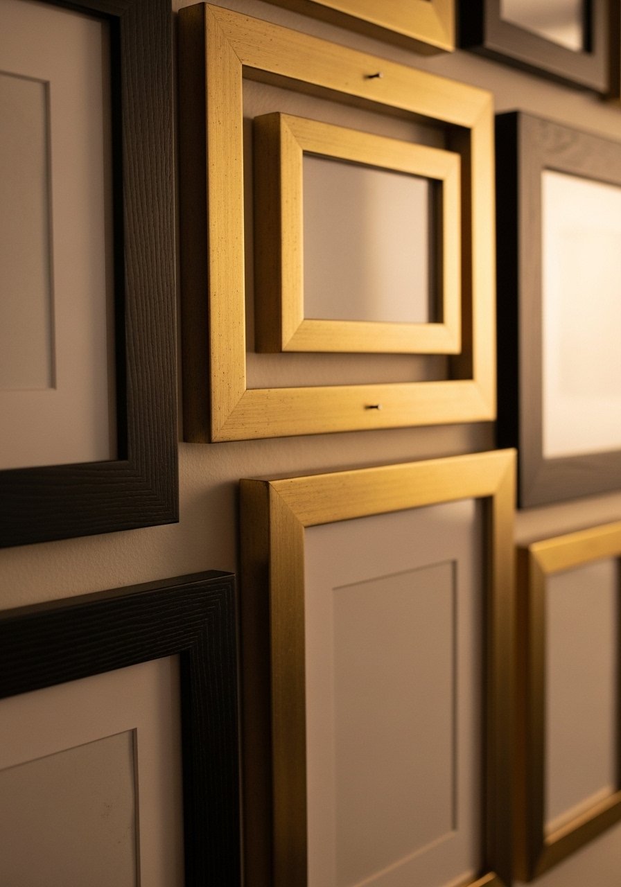 I used mixed metallic frames to keep a gallery wall feeling intentional instead of matchy. Pair warm brass with matte black for contrast. For visual rhythm, use three brass frames among every five frames. A picture frame faux pas is using different frame widths that fight for attention. Keep mat sizes consistent to unify the collection. On brick or textured walls use heavier anchors. Find mixed metal picture frames set to start.