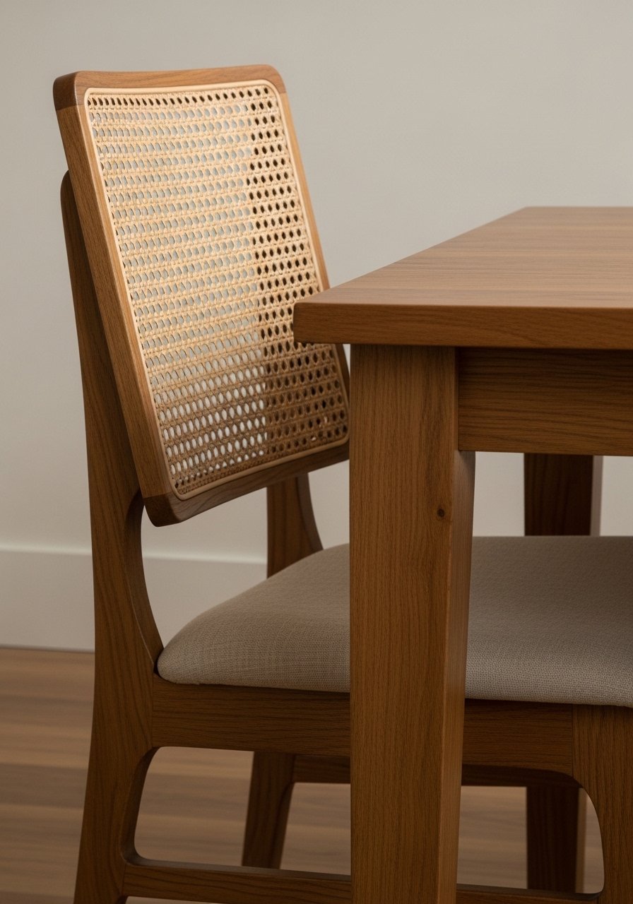 I replaced two dining chairs with cane-backed versions and the table looked lighter immediately. Cane reads both modern and vintage. For durability, check seat joinery. Cheap cane can sag. In large dining rooms mix cane with upholstered chairs for comfort. Avoid using cane on high-moisture areas without a protective finish. Cane looks fragile in photos but is sturdy in person when constructed well. Find cane dining chair set for a similar update.