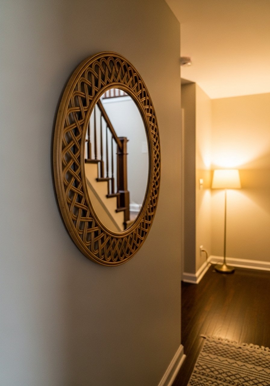 An oversized mirror opened up my dark hallway and added surface texture. I prefer round mirrors with braided rattan or carved wood frames. The mirror should be at eye level. In photos mirrors add light dramatically. In person, the frame material matters more than the size. Cheap mirrors with thin frames read flat. Use a mirror at least 30-36 inches for narrow halls. I used 36-inch round rattan mirror in my entry.