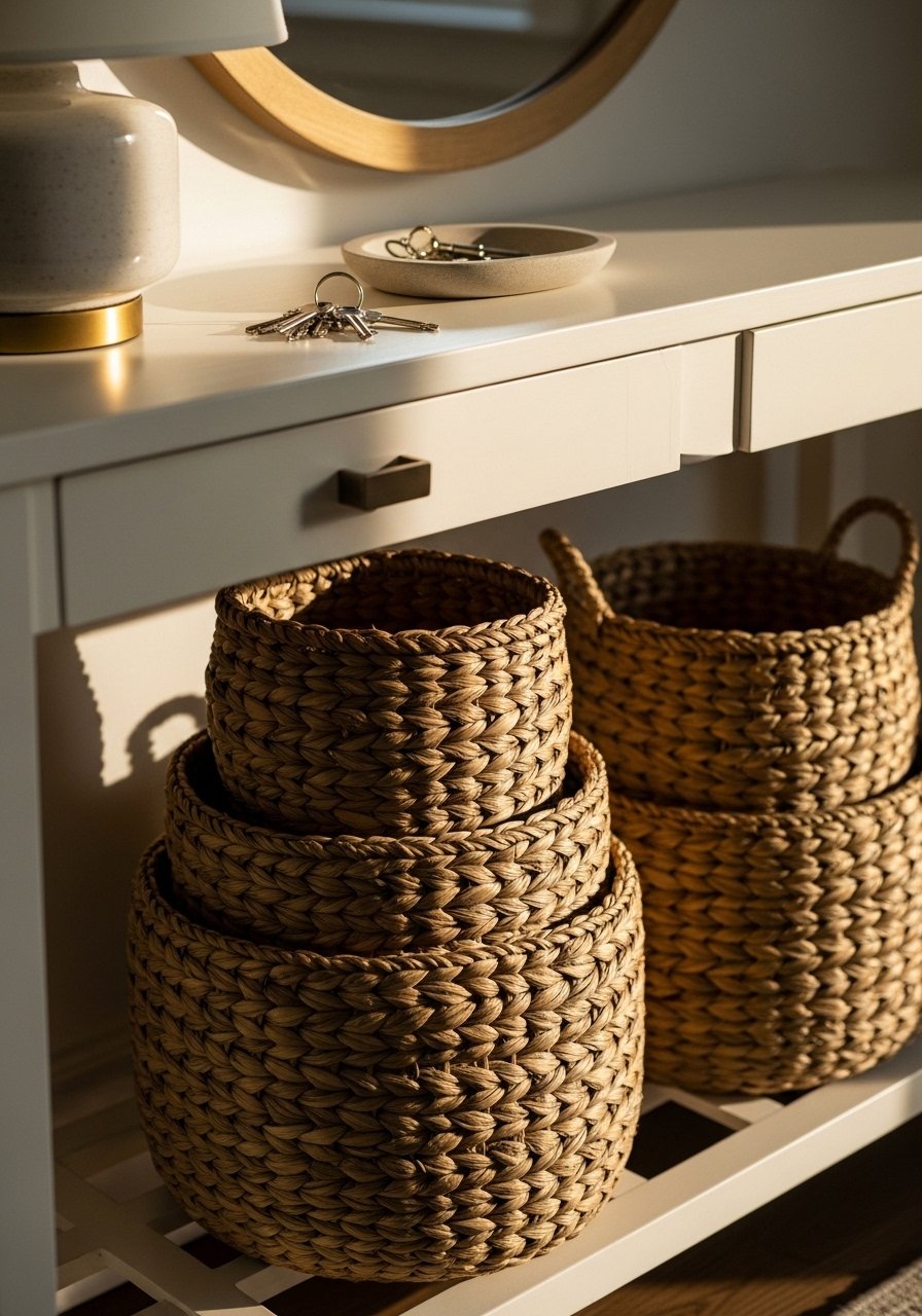 I swapped a plastic bin for handwoven baskets and my entryway looked finished. Baskets add texture and practical storage. Use one large basket for shoe storage and a medium one for umbrellas. For small apartments choose flatter baskets to slide under benches. A common mistake is using mismatched sizes that compete. Use odd numbers and repeat materials to unify. Get seagrass baskets set of 3 for a cohesive look.