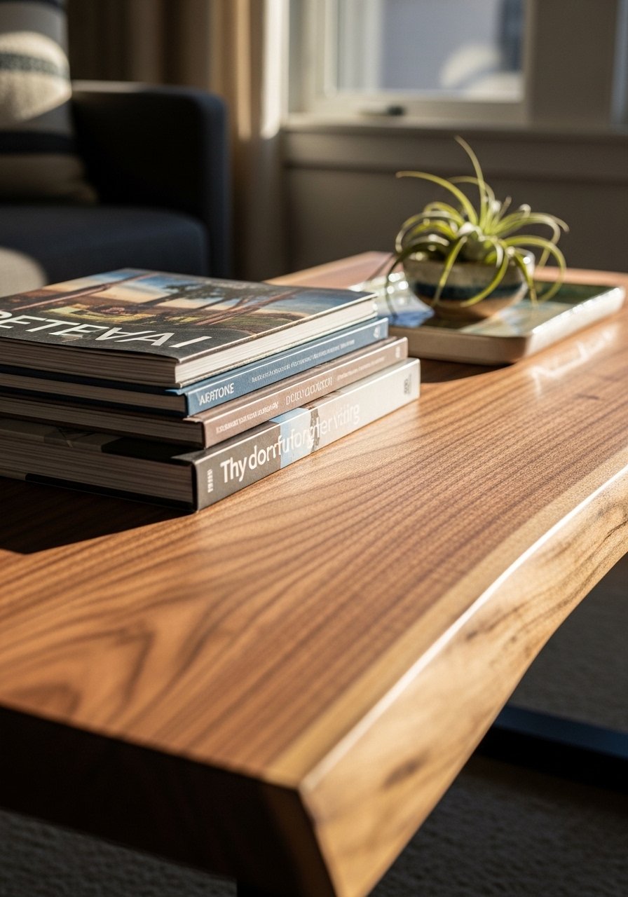 A raw-edge wood coffee table introduced an organic texture that centered my seating area. Live edge pieces have visual weight. For small living rooms choose a narrower profile to keep flow. A common mistake is picking a top-heavy table that blocks legroom. Pair raw wood with a soft rug to balance hardness. Photos highlight grain. In person, maintenance matters. Check for proper sealing to prevent stains. I recommend live-edge walnut coffee table.