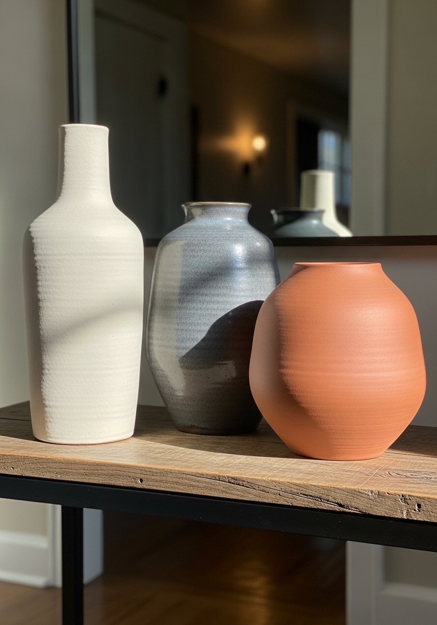 Grouping sculptural ceramics creates a small still life of texture in entryways. I arrange vases in odd numbers and vary heights by at least three inches. A mistake is using too many glossy pieces that reflect light unevenly. In photos handmade ceramics look artisanal. In person, they add a crafted feel that mixed mass-produced pieces cannot. For cohesion pick a unified palette. Try matte sculptural ceramic vase set.