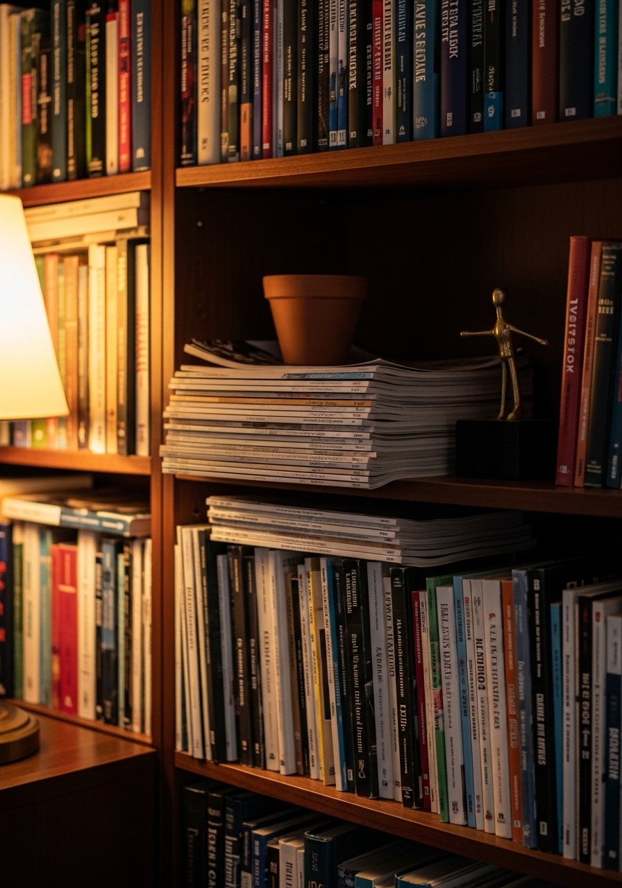 A shelf full of identical paperbacks looks flat. I mix cloth-bound volumes, matte covers, and a few glossy art books to introduce texture in the reading nook. Style ratio: two-thirds books, one-third objects. In photos books may look perfectly stacked. In reality, stagger heights and use odd-number groupings. A common mistake is crowding every shelf. Leave negative space to let textures breathe. For a finishing touch, add cloth-bound design books.