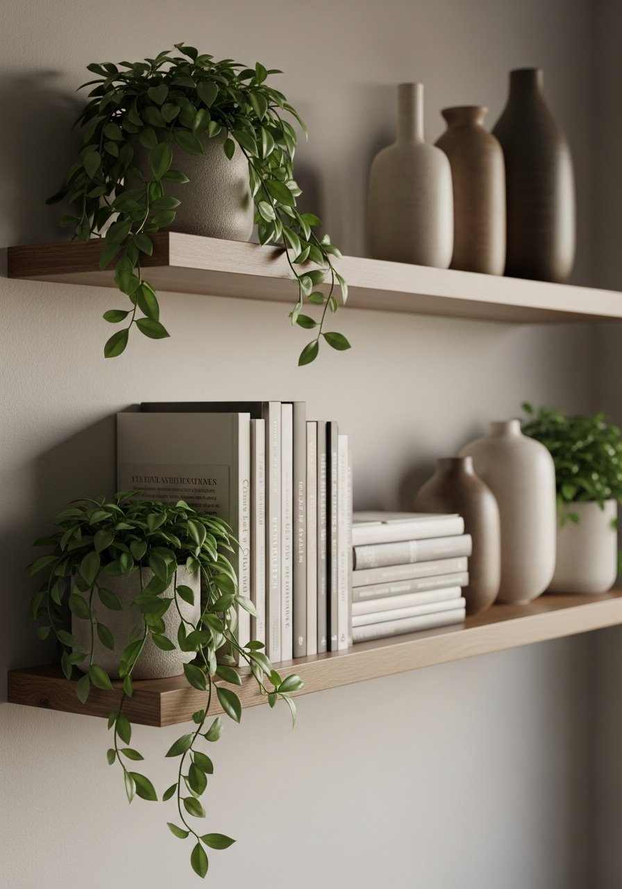 Floating Shelves With Curated Greenery for Vertical Interest
