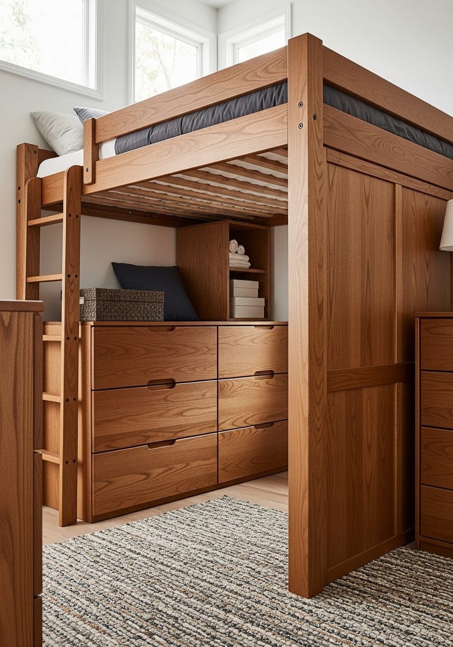 Lofting my bed gave me real living area underneath for a desk and sofa. I chose a wood loft with drawers and used rolling bins below for seasonal clothes. A loft bed creates zones — sleep up top, living below — which makes a studio feel like a one-bedroom. Common mistake: low clearance under the loft. Measure for headroom before you buy so the area underneath feels usable, not cramped.