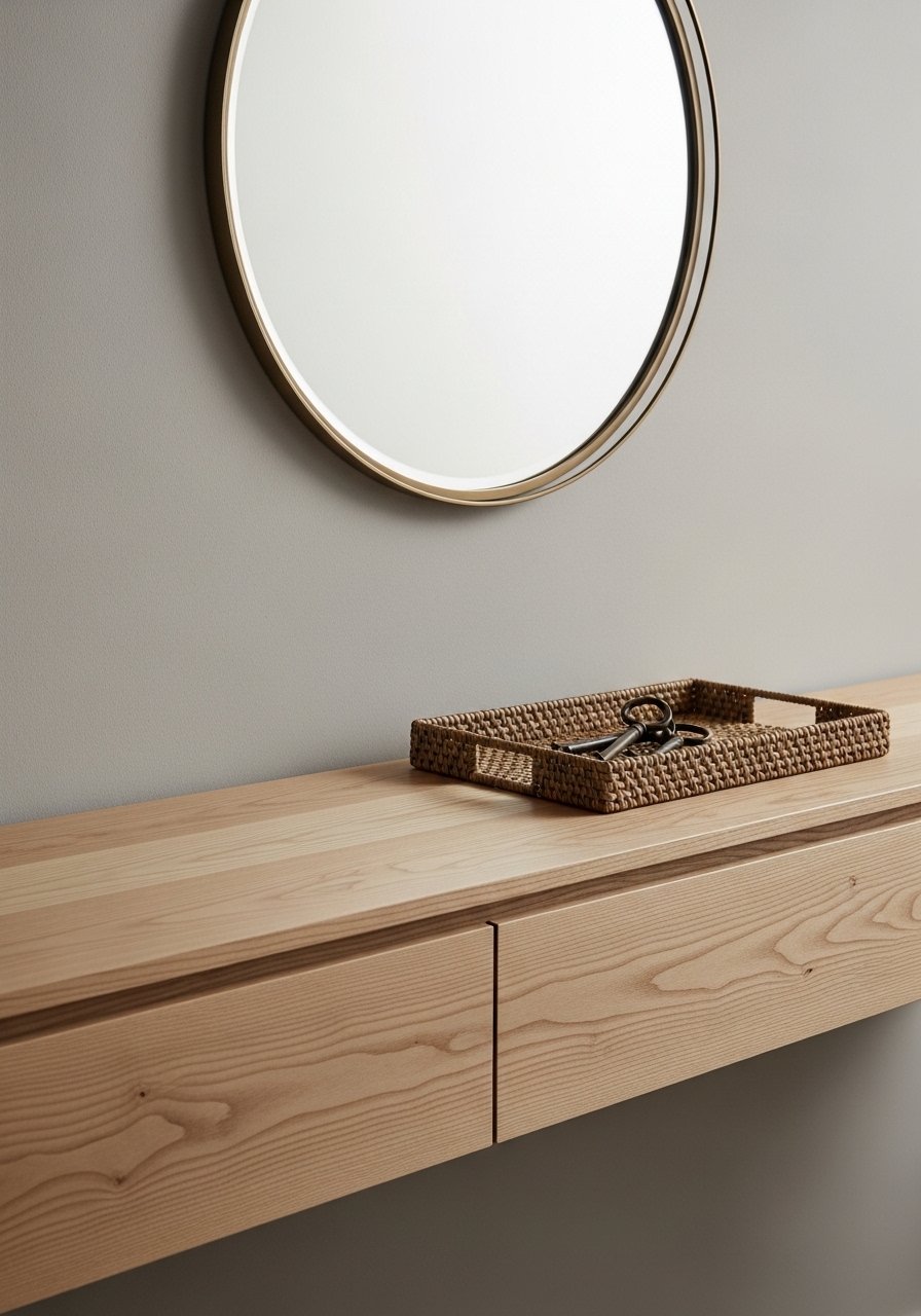 My entryway is only 30 inches wide, so a narrow console with hidden drawers was perfect. I grabbed a slim console with two soft-close drawers and keep mail in one, sunglasses in the other. I paired it with a 36-inch round mirror to bounce light. Avoid bulky hardware and opt for slim legs — bulky bases swallow space. This approach keeps the entry tidy and gives you a proper drop zone without crowding the hallway.