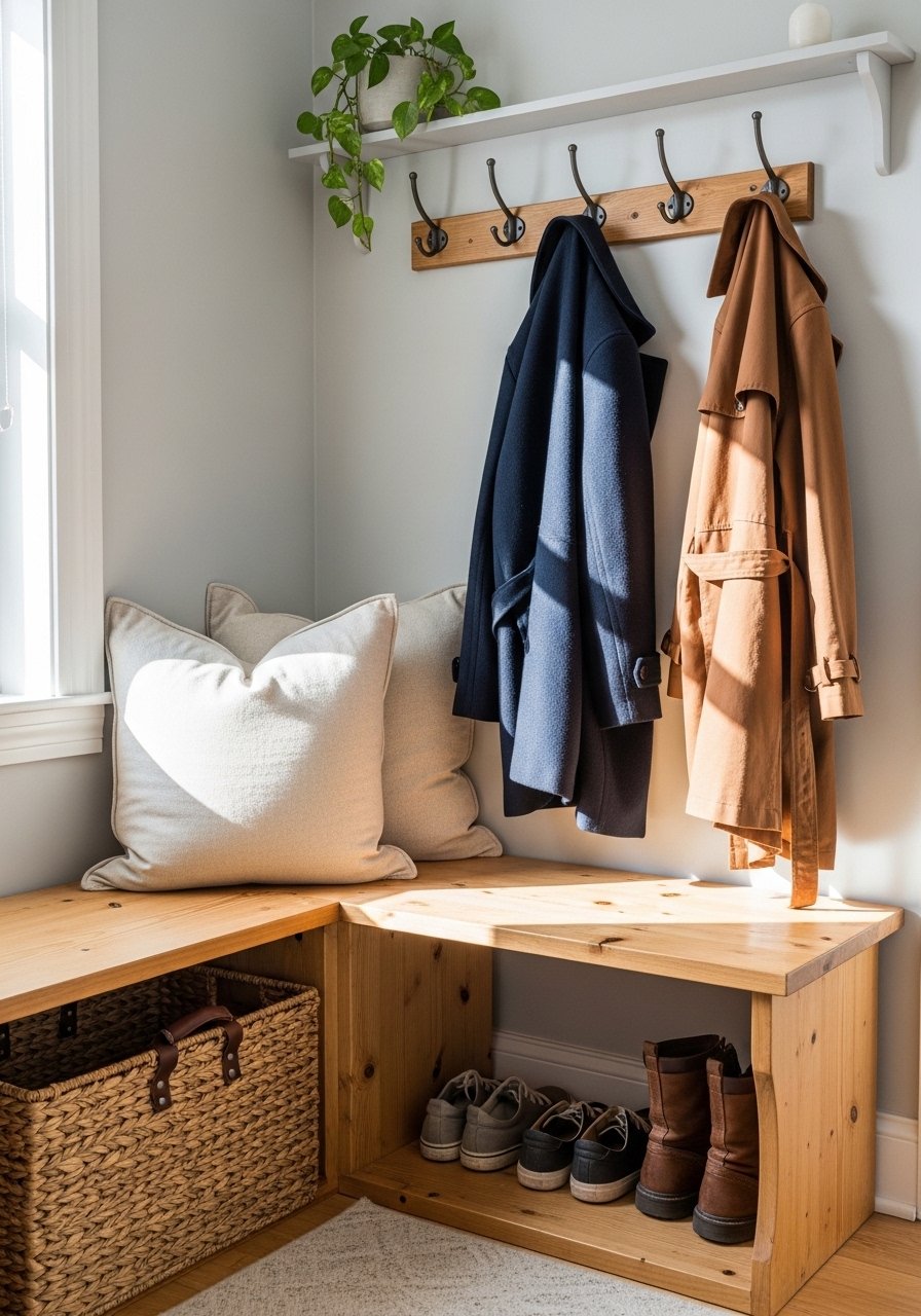 A corner bench with under-seat shoe storage turned my tiny entry into a functioning mudroom. I used a 36-inch bench with a lift-top and put baskets underneath for sneakers. The bench doubles as seating and clears floor clutter instantly. Mistake to avoid: choosing shallow storage — deeper bins hold more and hide the mess. This small change makes coming home feel organized and gives guests a place to sit without adding bulk.