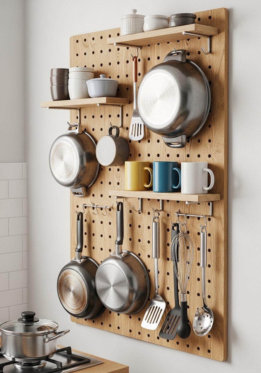 A vertical pegboard turned a blank wall into organized storage for my pots, mugs, and utensils. I used hooks and a small shelf to keep counters clear. This frees up cabinets and brings a workshop-style efficiency to a tiny kitchen. Don’t cram every tool on the board — leave gaps so each item is easy to grab. Pegboards are a smart vertical storage hack that keeps things visible and adds a purposeful, modern look.