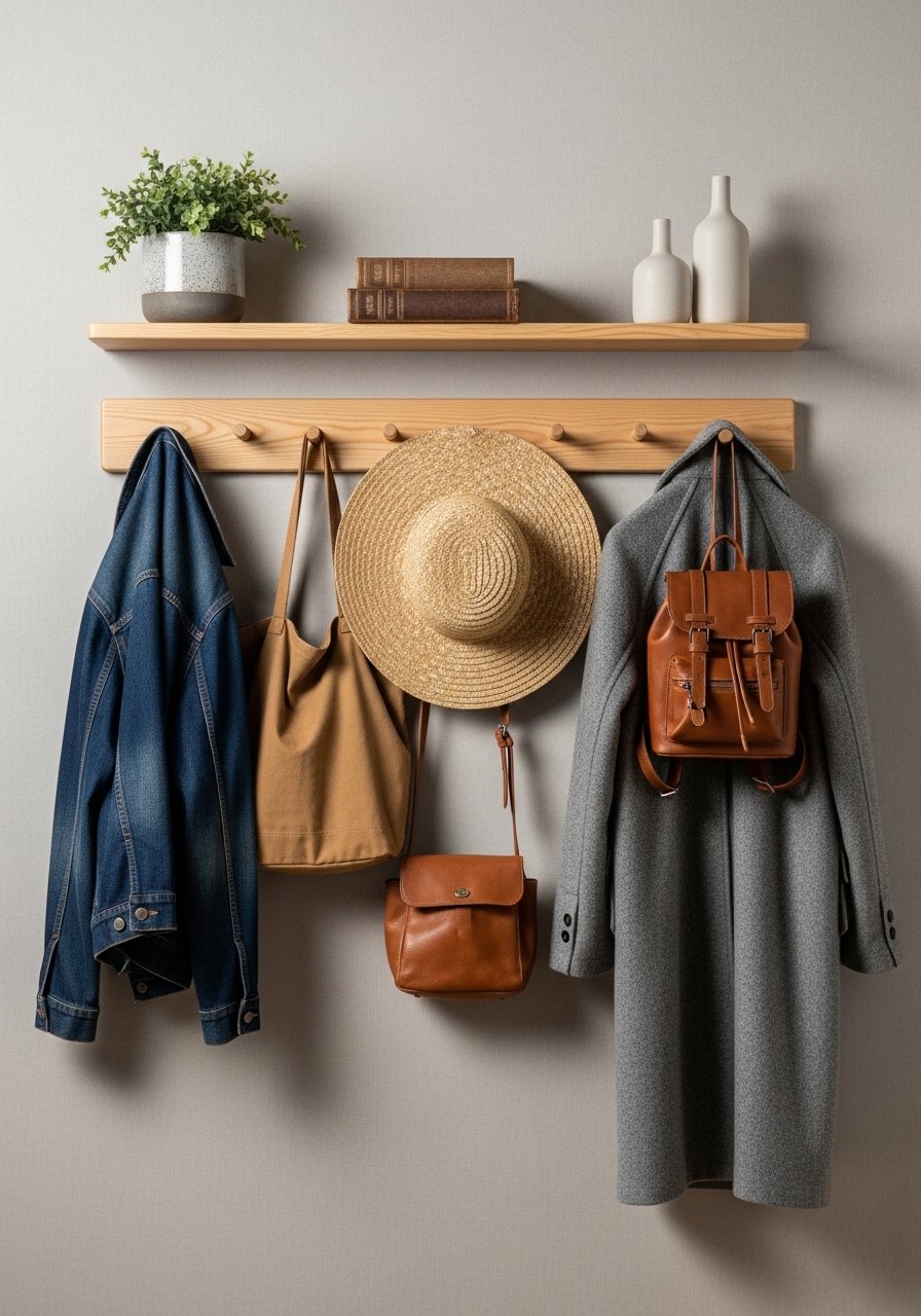 Replacing a bulky coat rack with a peg rail freed my hallway floor instantly. I installed a 4-peg rail at shoulder height and use woven baskets underneath for scarves. It keeps things off the floor and reads tidy. The mistake is hanging it too low — aim for 5-5.5 feet so coats hang naturally. Peg rails are simple, budget-friendly, and perfect for tiny homes where every inch counts.