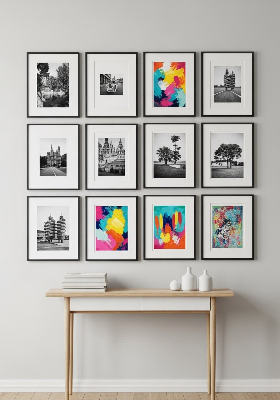 I created a gallery grid with slim black frames and identical white mats for a cohesive look that doesn’t overwhelm a small wall. Using frames in a 3×3 grid gives impact without clutter. I thrifted frames and bought new mats to keep costs down. Don’t mix too many frame styles — consistency reads cleaner in a tight space. A curated gallery adds personality and depth without eating square footage.
