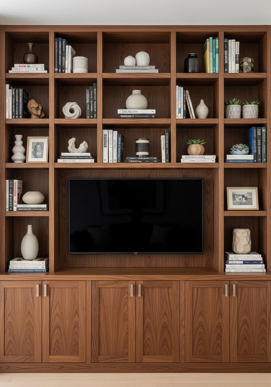 I framed my TV with built-in shelving that includes lower cabinets for media clutter and open shelves for styling. This creates a focal wall and hides unsightly wires. Keep lower storage closed and use open shelving above in odd-number groupings for visual balance. Mistake to avoid: over-styling the shelves — leave negative space so the TV remains the focal point. Built-ins make a small living area feel designed and intentional.