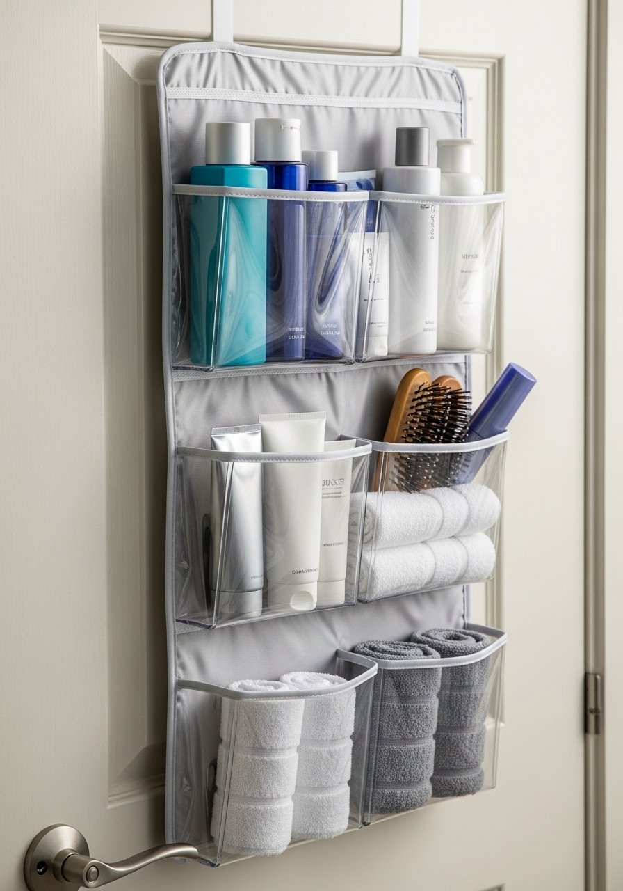 An over-the-door organizer freed up my tiny bathroom cabinet. I store hair tools, lotions, and extra toilet paper in clear pockets for easy access. It’s an inexpensive way to gain shelves without drilling. Avoid using flimsy hooks; pick a sturdy over-the-door with rubber stops to prevent noise. This small addition solves storage pain points and keeps counters clear for a cleaner, calmer bathroom.
