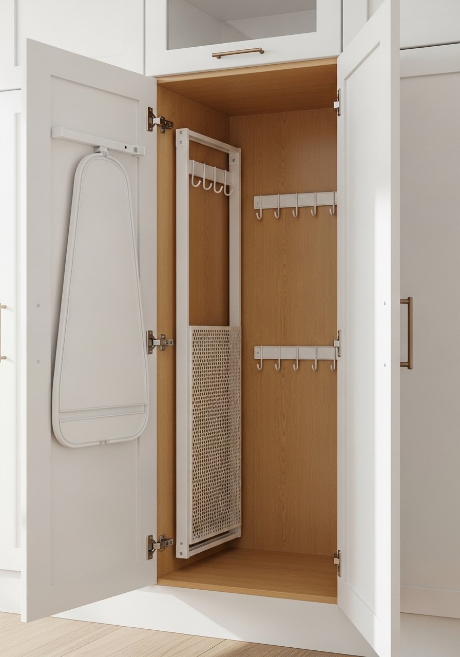 I mounted a slim laundry caddy behind a pantry door: collapsible drying rack, small detergent shelf, and a pull-out bin. Hiding laundry supplies keeps the kitchen tidy and the visual clutter down. Mistake to avoid: leaving everything visible — concealment keeps the space feeling calm. A compact laundry station is one of those under-covered angles that makes daily chores feel manageable in a tiny home.