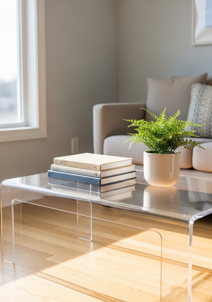 I swapped a chunky coffee table for a clear acrylic one to reduce visual weight. It reads almost invisible, so the room feels less crowded while keeping surface area. Acrylic works great with rugs and layered textures. Mistake to avoid: placing it on a busy patterned rug where it disappears completely — choose a subtle rug so the table reads functional. Clear furniture is a designer trick that keeps sightlines open in compact spaces.