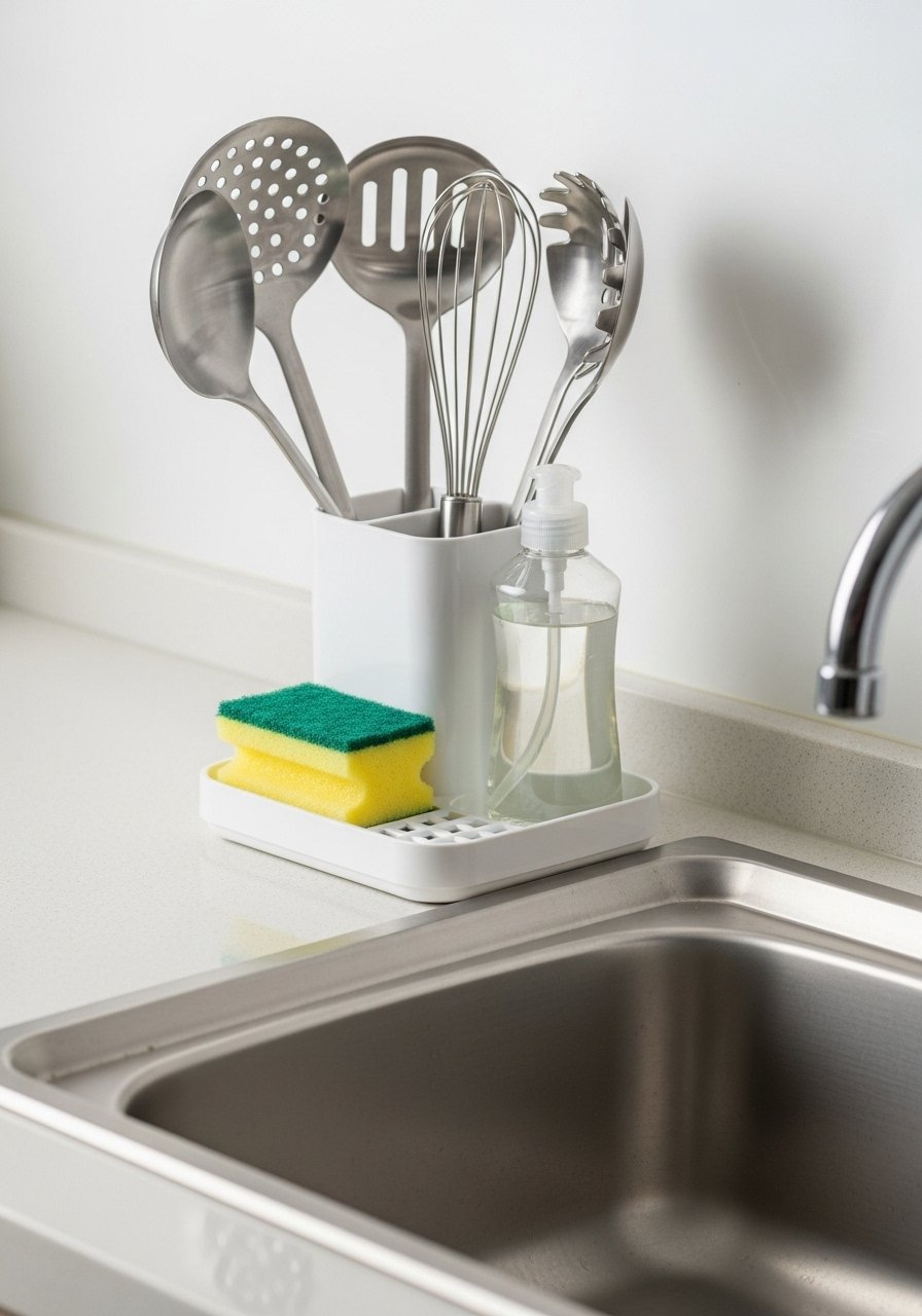 I keep a slim kitchen caddy near the sink to corral soap, scrubbers, and frequently used utensils. It keeps counters clean and feels more organized than a scattering of items. Choose a metal or bamboo caddy you can rinse. Mistake to avoid: using a bulky caddy that becomes another countertop island — pick a slim profile. This small change makes the kitchen feel intentional and less chaotic.