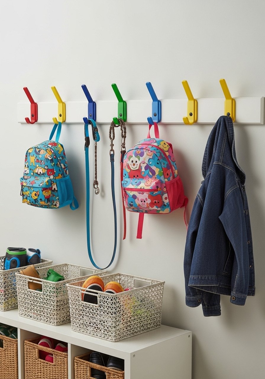 I installed smart wall hooks at varying heights for backpacks, leashes, and hats. Hooks save floor space and keep essentials grab-and-go ready. Use heavy-duty anchors and place a small shelf above for keys. Mistake to avoid: mounting hooks too high for kids — make some lower so everyone helps keep the space tidy. This simple solution addresses daily chaos and keeps busy households running smoother in compact homes.