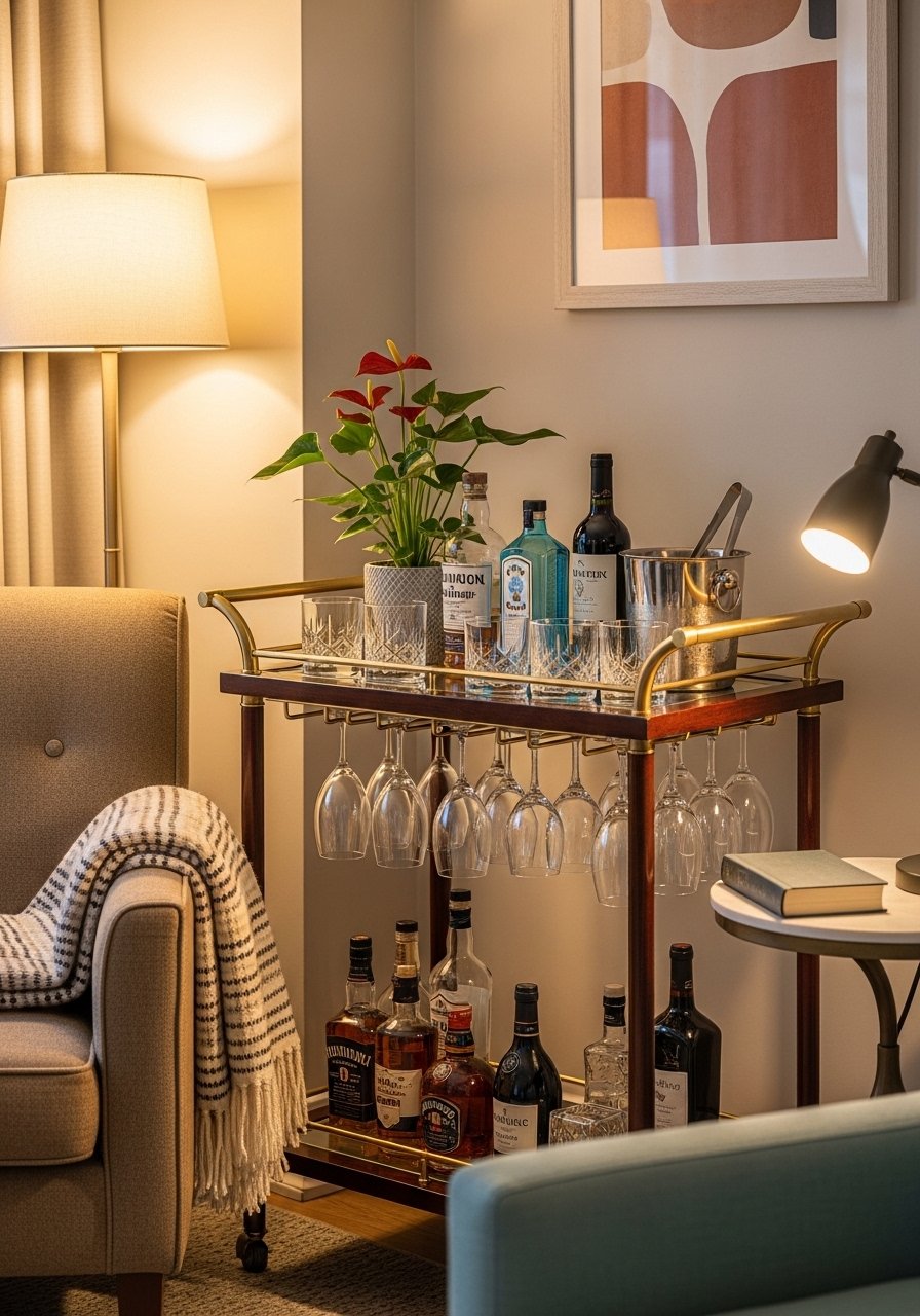 A compact bar cart doubled as serving space when we hosted. I keep a small tray of glasses, a cocktail kit, and a stack of napkins. It moves where I need it and tucks away when not in use. Mistake to avoid: overloading it — leave space to serve. A bar cart provides surface area and style without committing to a large buffet or table.