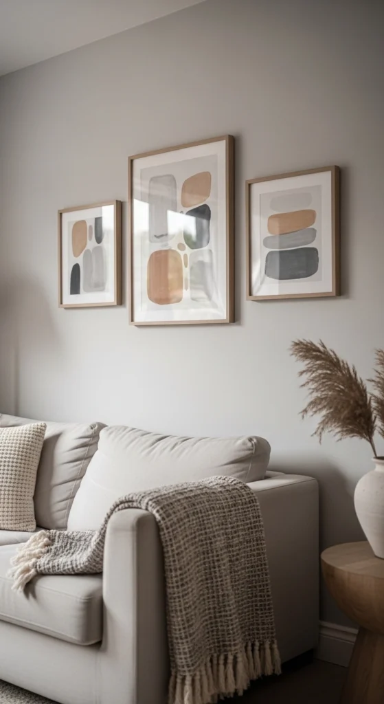 This style suits small rooms where heavy decor feels overwhelming. One or two prints can fill space without closing it in.