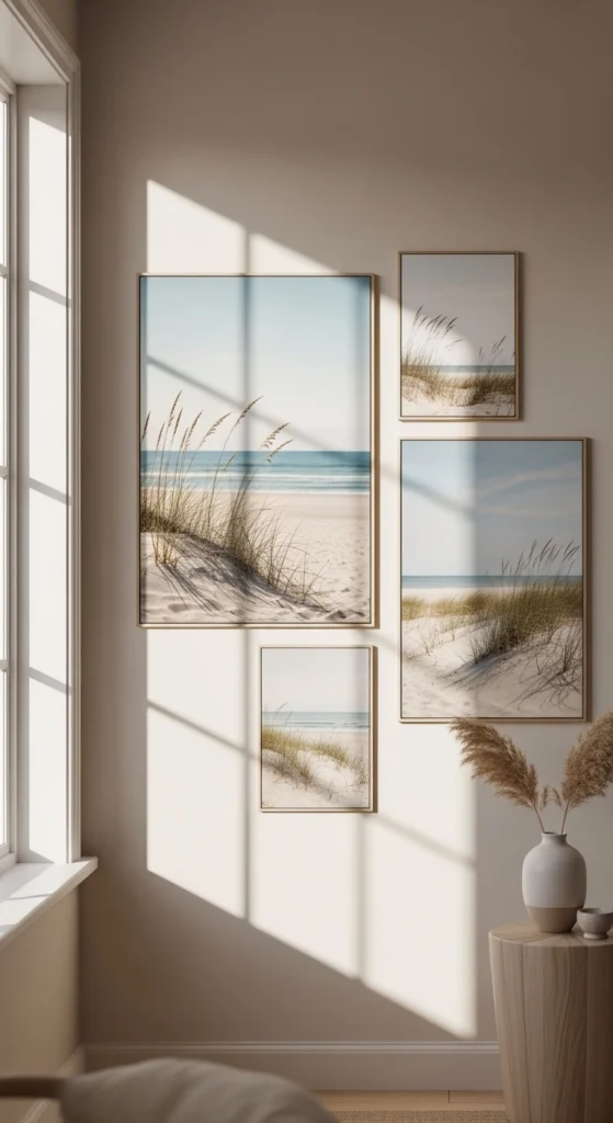 Coastal art feels calm even far from the sea. Stick to soft tones.