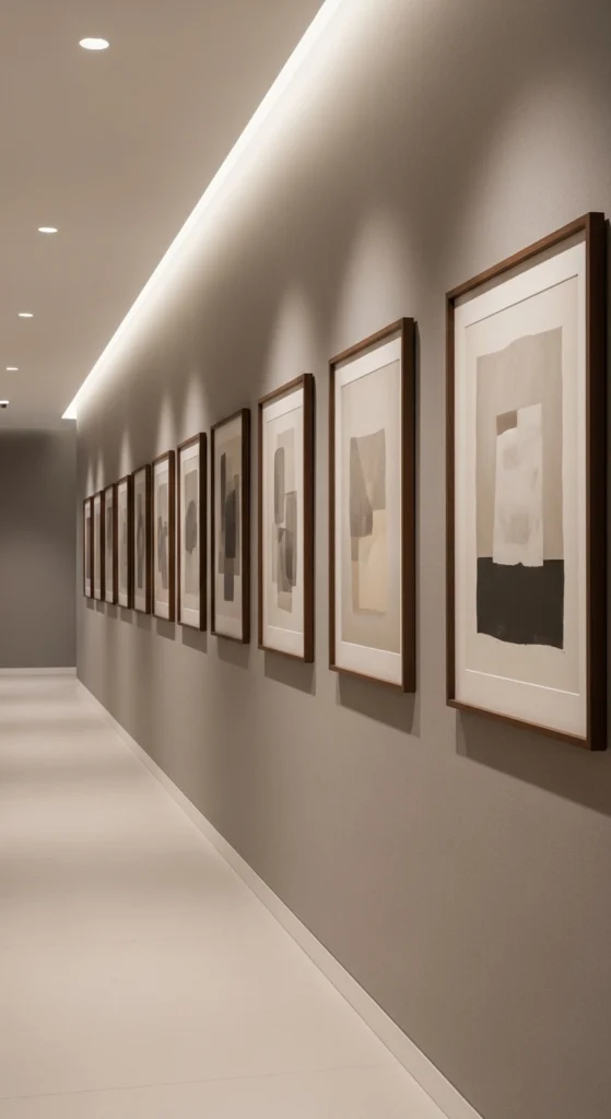 Hallways benefit from repetition. Use similar frames and spacing.