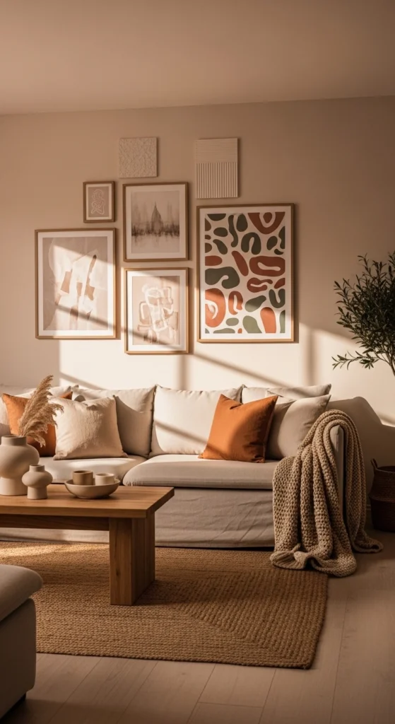 Japandi wall decor mixes Japanese calm with Scandinavian warmth. It works well when walls feel empty but you do not want clutter. Choose simple art with soft shapes, nature themes, or abstract lines. Keep colors gentle. Think sand, clay, warm grey, and sage.