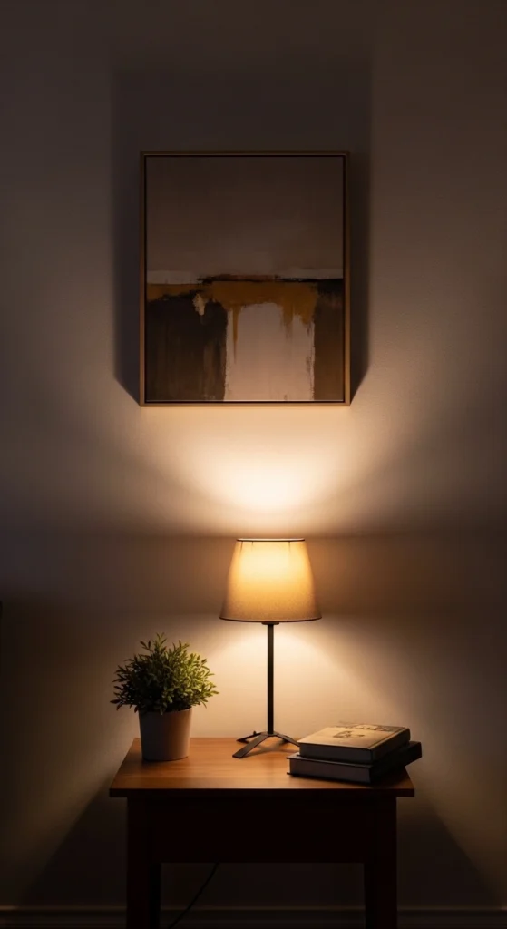 You do not need gallery-priced artwork. Large-scale posters, canvas prints, or even fabric wall hangings can create the same effect. Stick to warm tones or soft contrast so the piece feels calm, not loud.