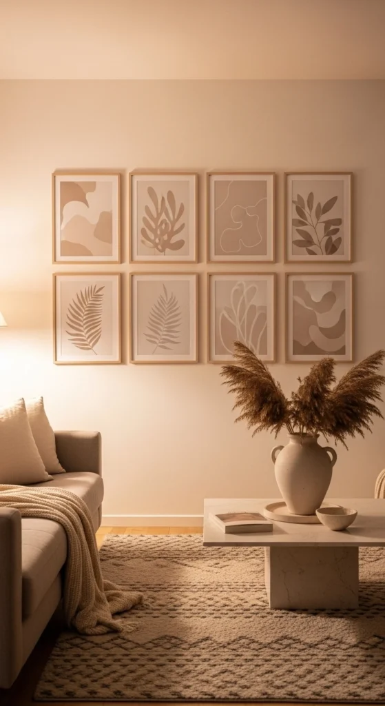 Gallery walls still work when done with restraint. Neutral palettes keep them calm and easy to live with. Use prints in similar tones so the wall feels connected.