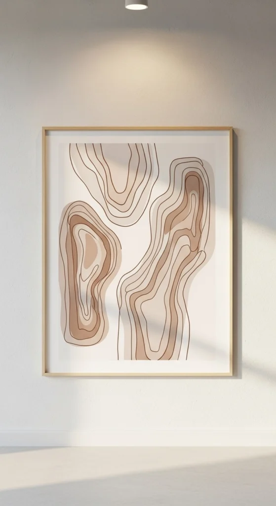 Line art keeps walls light and simple. Soft curves feel more inviting than sharp angles. Choose warm shades instead of stark black.