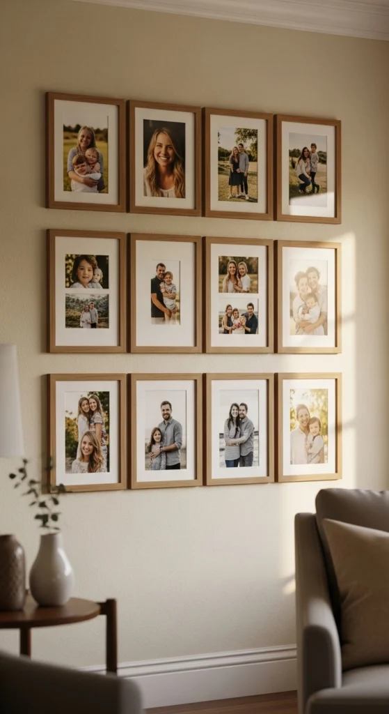 Personal photos make walls feel lived in. A simple grid keeps things tidy and avoids clutter.