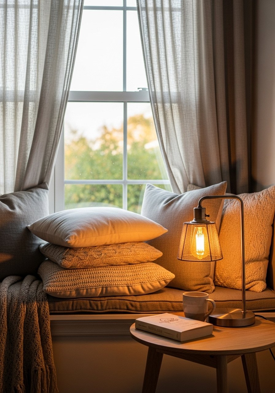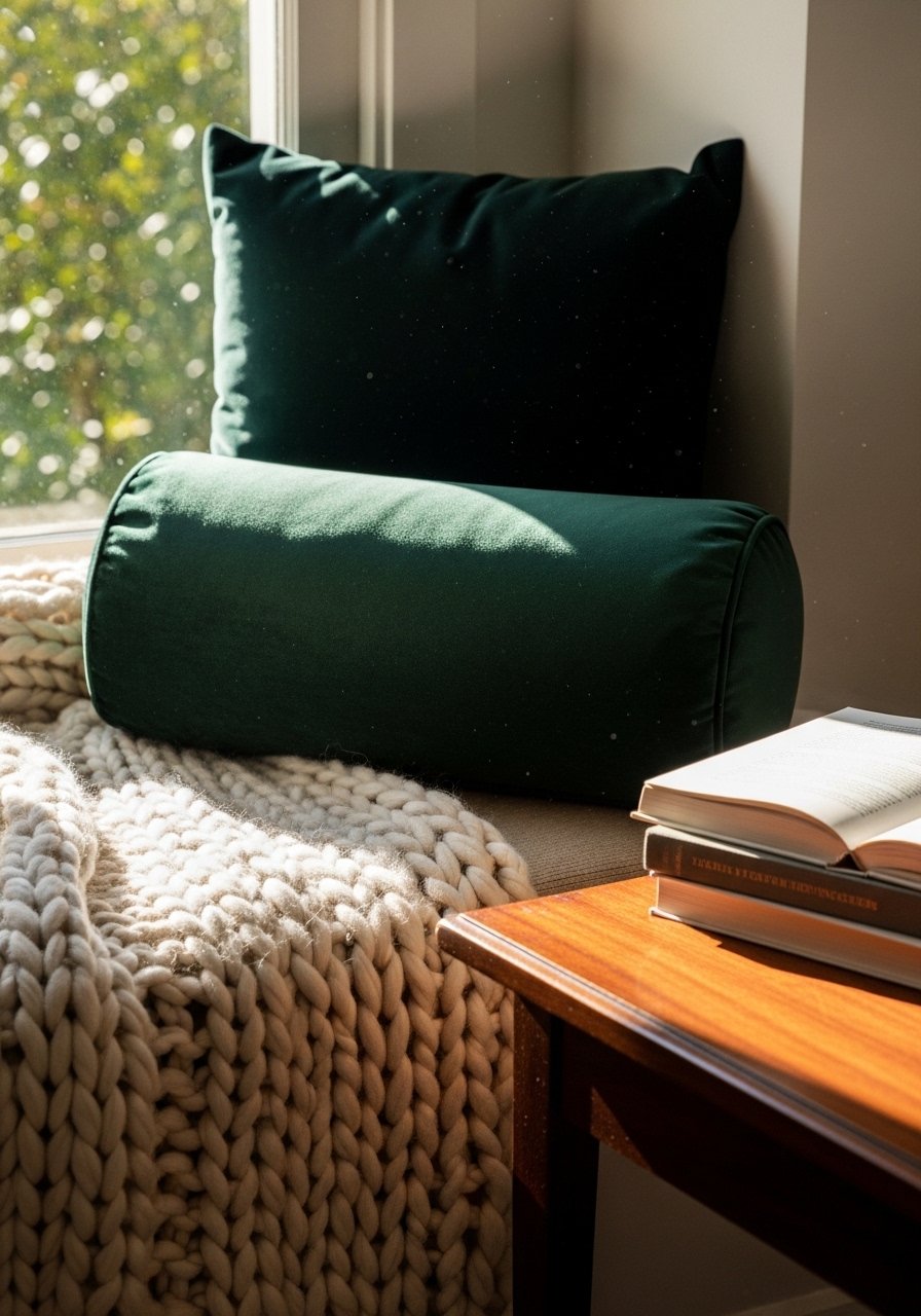 I built a nook by adding a cream chunky knit throw and a velvet lumbar pillow. The layered textures read cozy, not cluttered, when I stick to three textures: knit, velvet, and wood. This feels relaxed and warm for winter evenings. Avoid piling too many small cushions — odd numbers (three) look intentional. This uses cozy, organic textures and keeps the area functional for reading or sipping tea.
