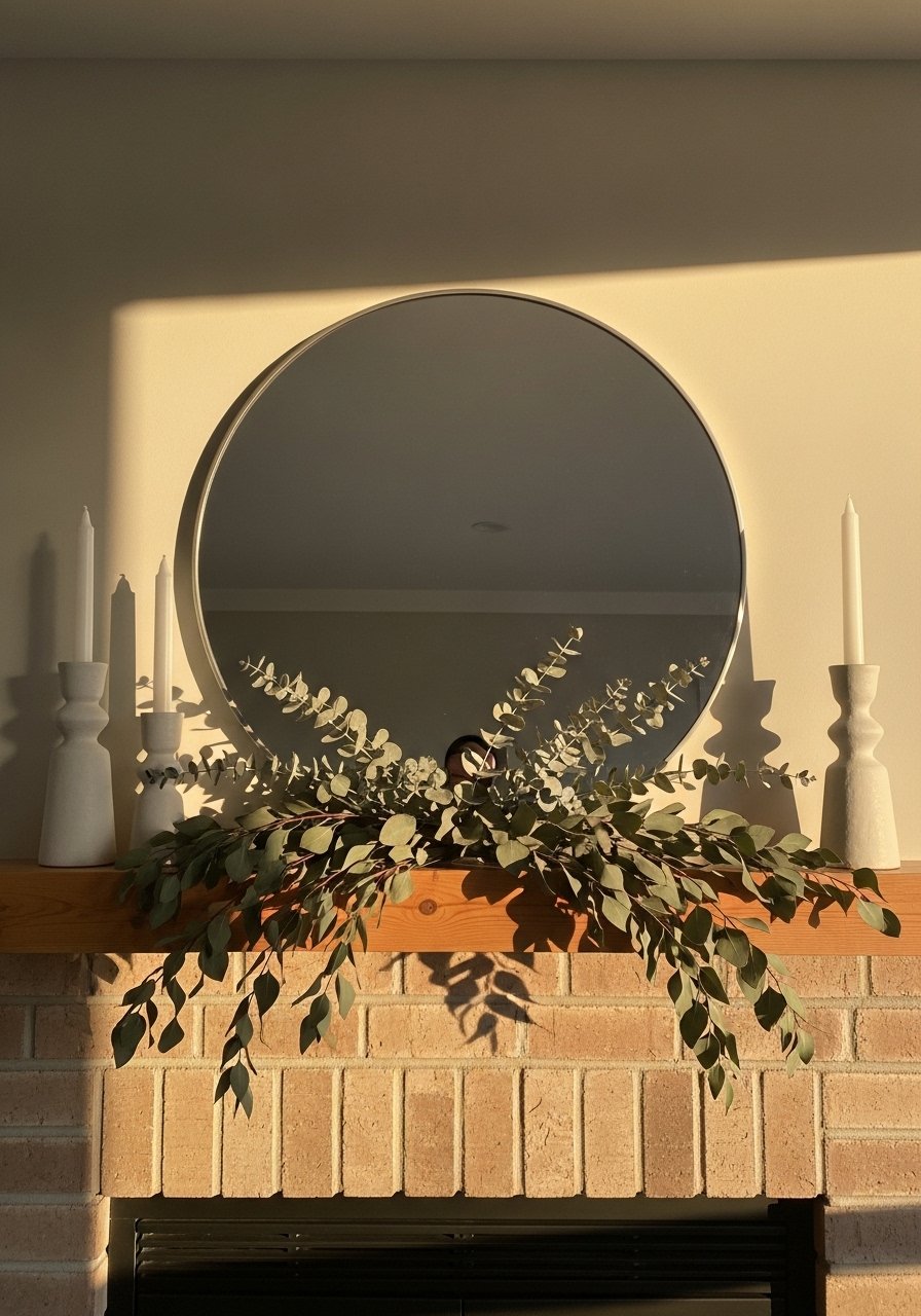 I styled my mantel with a 36-inch round mirror, dried eucalyptus garland, and ceramic candlesticks. The mirror bounces light into dark corners while natural elements add warmth without breaking the minimalist aesthetic. Keep odd-number groupings and vary heights for balance. One mistake to avoid: over-accessorizing with too many small items — it reads busy. This approach combines organic textures with reflective surfaces for bright, warm winter evenings.