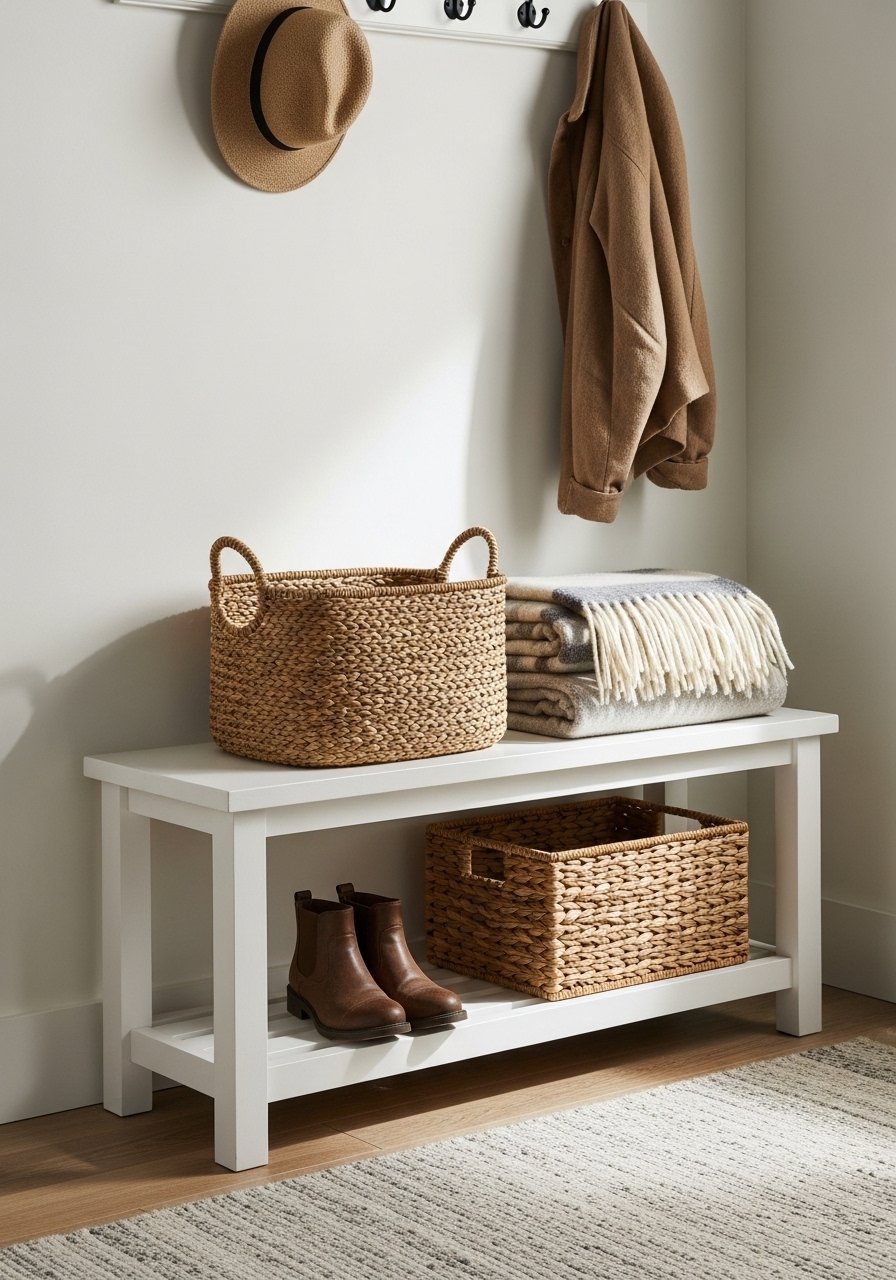 A simple white oak bench plus a woven storage basket hides winter gear and keeps the area tidy. I added a wool throw for texture and swapped plastic bins for woven baskets from HomeGoods for better warmth. Renter-friendly tip: use adhesive wall hooks instead of drilling. Avoid tiny rugs that don’t anchor the space — choose at least a 2×3 runner. This helps combat cluttered cold entries.