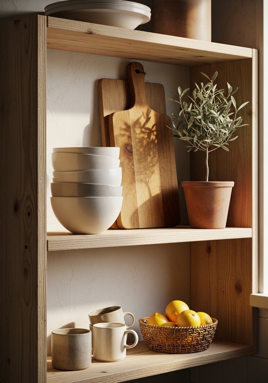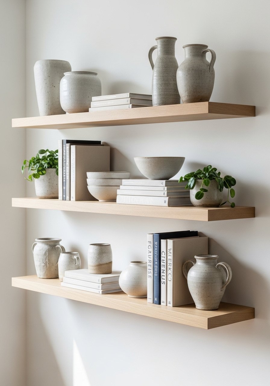 Open shelves read warm when you mix books, pottery, and a 6-foot artificial fiddle leaf fig nearby for height. I follow an odd-number rule and vary textures for interest. Don’t overload shelves; leave breathing room. A common mistake is matching everything — introduce one natural element like wood or clay to ground the display. This styling balances function and warmth while keeping shelves photo-ready and practical.