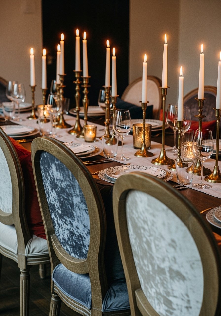 I swapped plain cushions for velvet chair pads and added brass candlesticks for instant warmth. Velvet adds plushness; brass introduces a warm metallic glow without shouting glam. Keep centerpiece low so conversation flows. Avoid mixing too many metal finishes at once — pick one dominant tone and sprinkle accents. This styling makes winter dinners feel intimate and slightly luxe without a big budget.