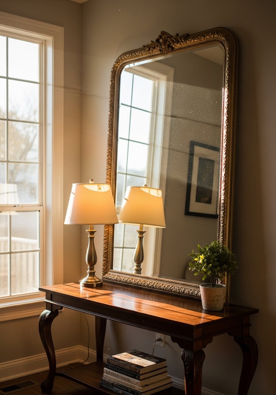 I leaned a 36-inch round mirror against the wall to double light in a dim hallway. Mirrors open space visually and reflect candle or lamplight for a warm glow. Keep the area around the mirror simple to avoid busy reflections. Avoid tiny mirrors in big rooms — scale matters. This is a low-cost way to make small rooms feel brighter and cozier during short winter days.