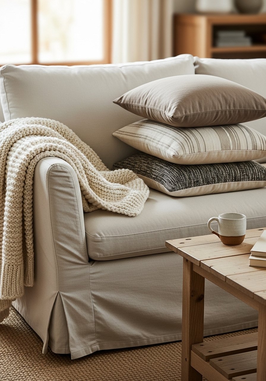 A slipcover lets you switch textures each season. I added this cream chunky knit throw and two velvet pillow covers for winter. Slipcovers from IKEA or Target are affordable and renter-friendly. Common mistake: using too many colors — stick to a core palette of two neutrals and one accent. This gives the sofa a fresh winter look without replacing furniture, and it’s easier to keep clean when life gets messy.