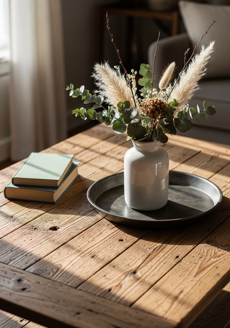 I styled my coffee table with a round wooden tray, a ceramic vase, and a candle cluster. Trays corral items and make the surface feel curated. Keep a balance of heights: stack two books topped by a decorative item. Avoid covering the entire table — leave space for mugs. This method gives a lived-in, warm look that’s practical for daily life and looks composed in photos.