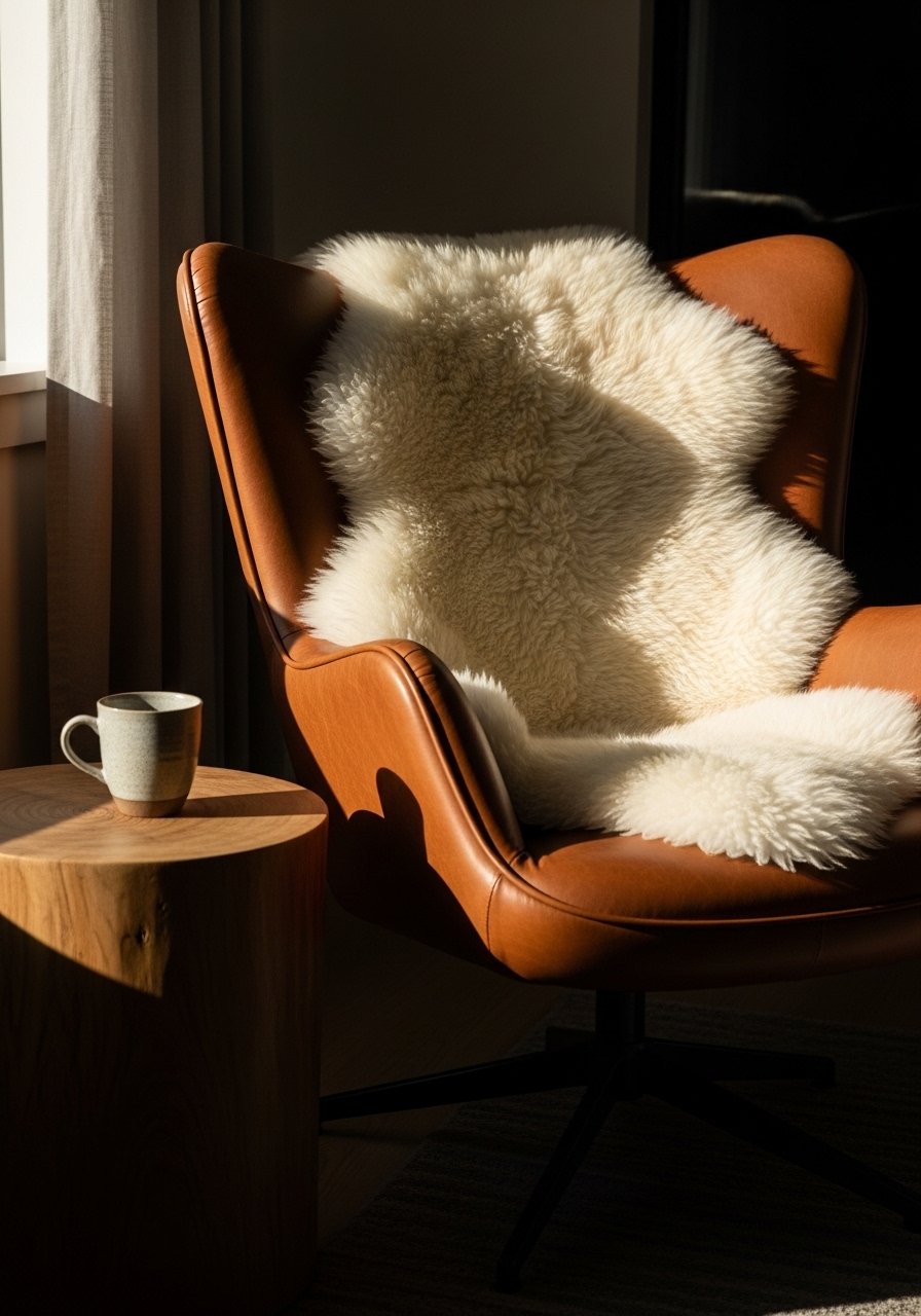 I soften a leather chair with a faux sheepskin throw. The leather adds structure; the sheepskin brings warmth underfoot. This combo is great for chilly mornings by the window. Avoid using thin synthetic fabrics that flatten — opt for plush textures. This pairing balances masculine and soft elements, creating a layered winter look that feels both refined and welcoming in real life.