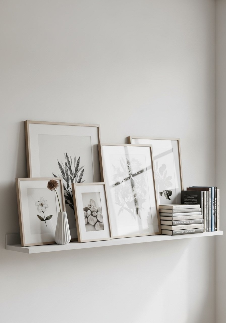 I mounted a white oak floating shelf and layered framed winter prints, a small ceramic vase, and sculptural objects. Shelves let you change art seasonally without hammering nails for each piece. Avoid tiny frames that look like clutter; choose one large piece and two supporting elements. This setup is renter-friendly and allows easy rotation, keeping the space feeling fresh and warm during winter months.