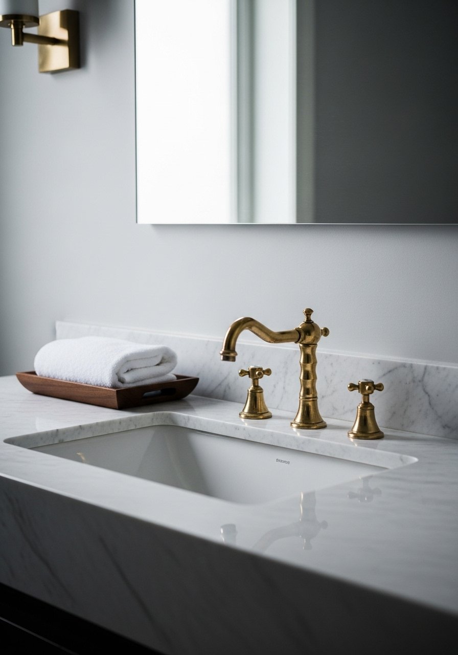 I swapped dull fixtures for brass accessory accents and added a wooden tray for soap and candles. Warm metals pair well with natural textures like wood and linen towels. Don’t overdo mixed metals — pick one warm tone as the hero. I noticed this warmer-metal look in boutique hotels recently; it makes a small bathroom feel intentionally cozy without renovation.