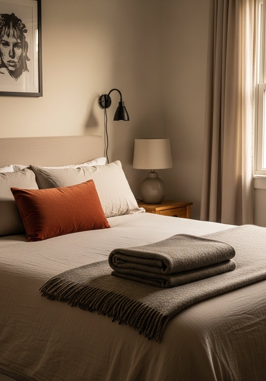 I keep bedding neutral and add one rust or deep green accent pillow to bring warmth. Use two euro shams and two standard pillows, then a single smaller accent for focus. I use wool throws for texture. Avoid piling on patterns; one accent color reads intentional. This creates peaceful mornings and a warm palette that feels current without being trendy.