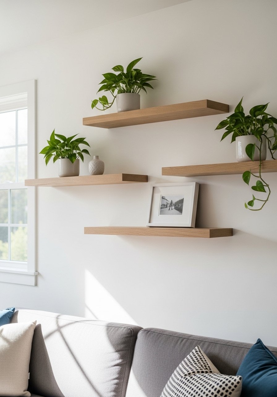 Floating Shelves with Potted Greenery for Modern Minimalist Living