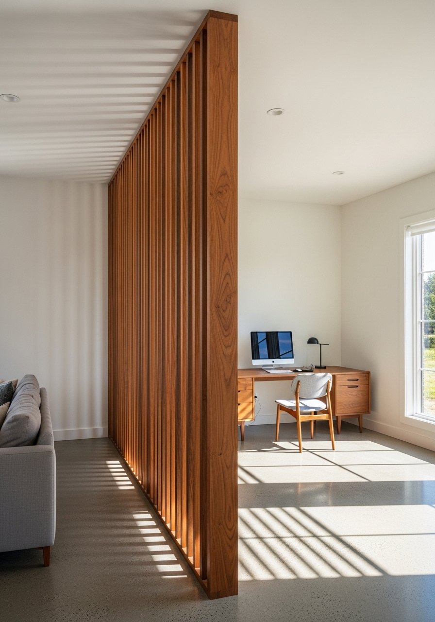 A wooden slatted divider gives privacy while keeping light flowing in an open plan. My upstairs loft felt instantly cozier after I added one. Use vertical slats to emphasize height and choose a warm oak finish to avoid feeling heavy. In small spaces place it 3 to 5 feet from the sofa to create a secondary circulation path. A cheap plastic screen will look flimsy, so avoid lightweight panels. Consider freestanding slatted dividers.